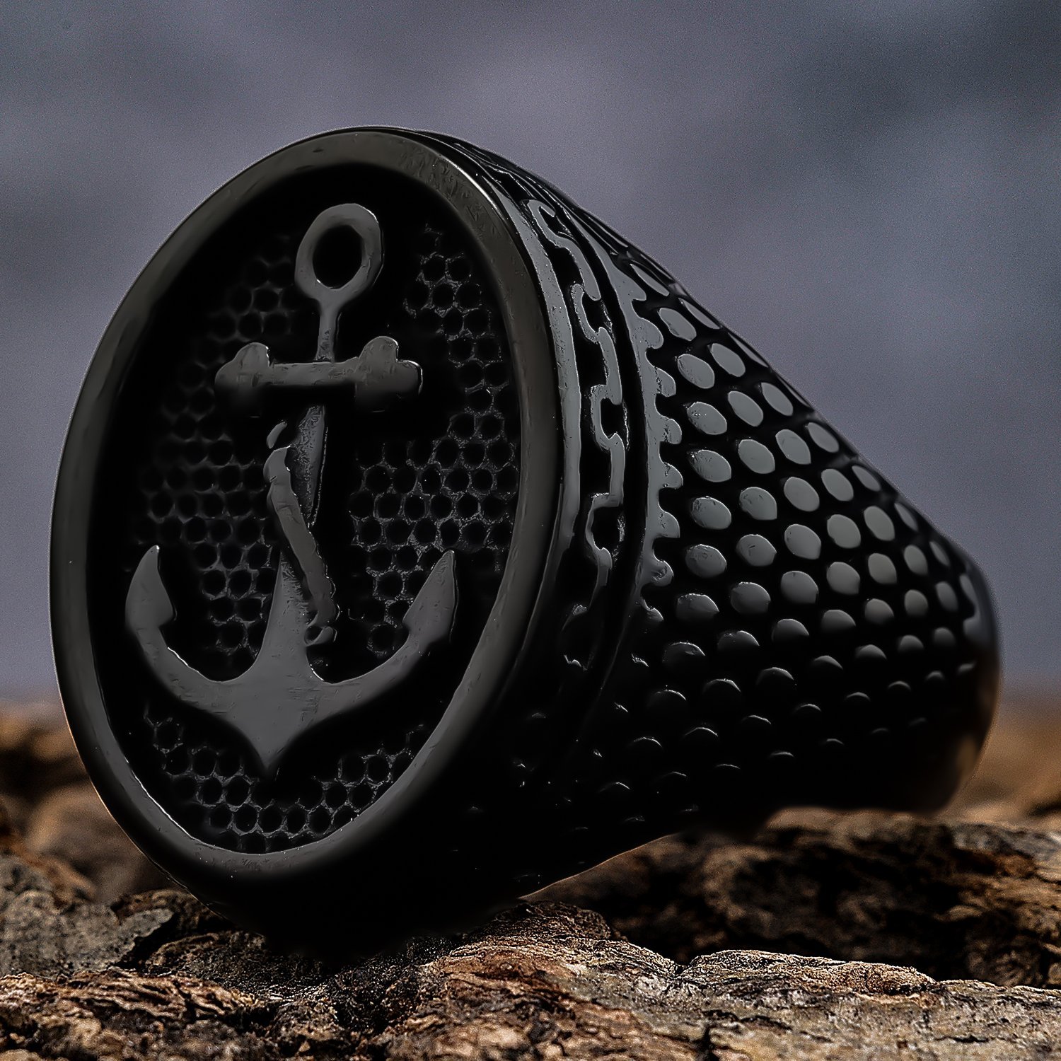 Anillo color negro con ancla.