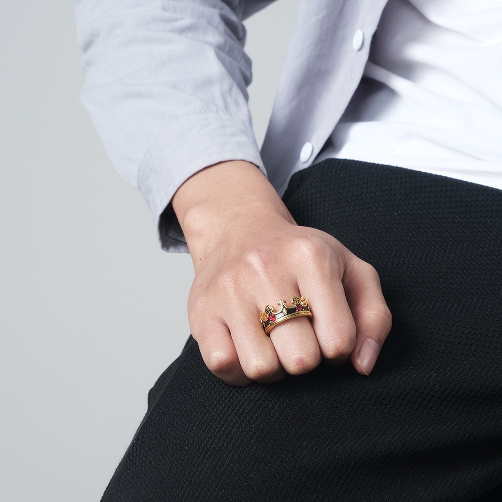 Anillo dorado de acero inoxidable en forma de corona con piedras rojas.