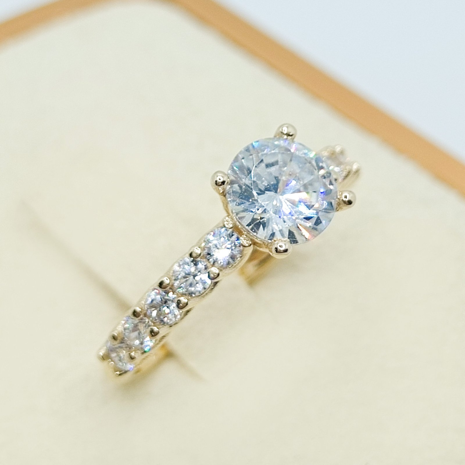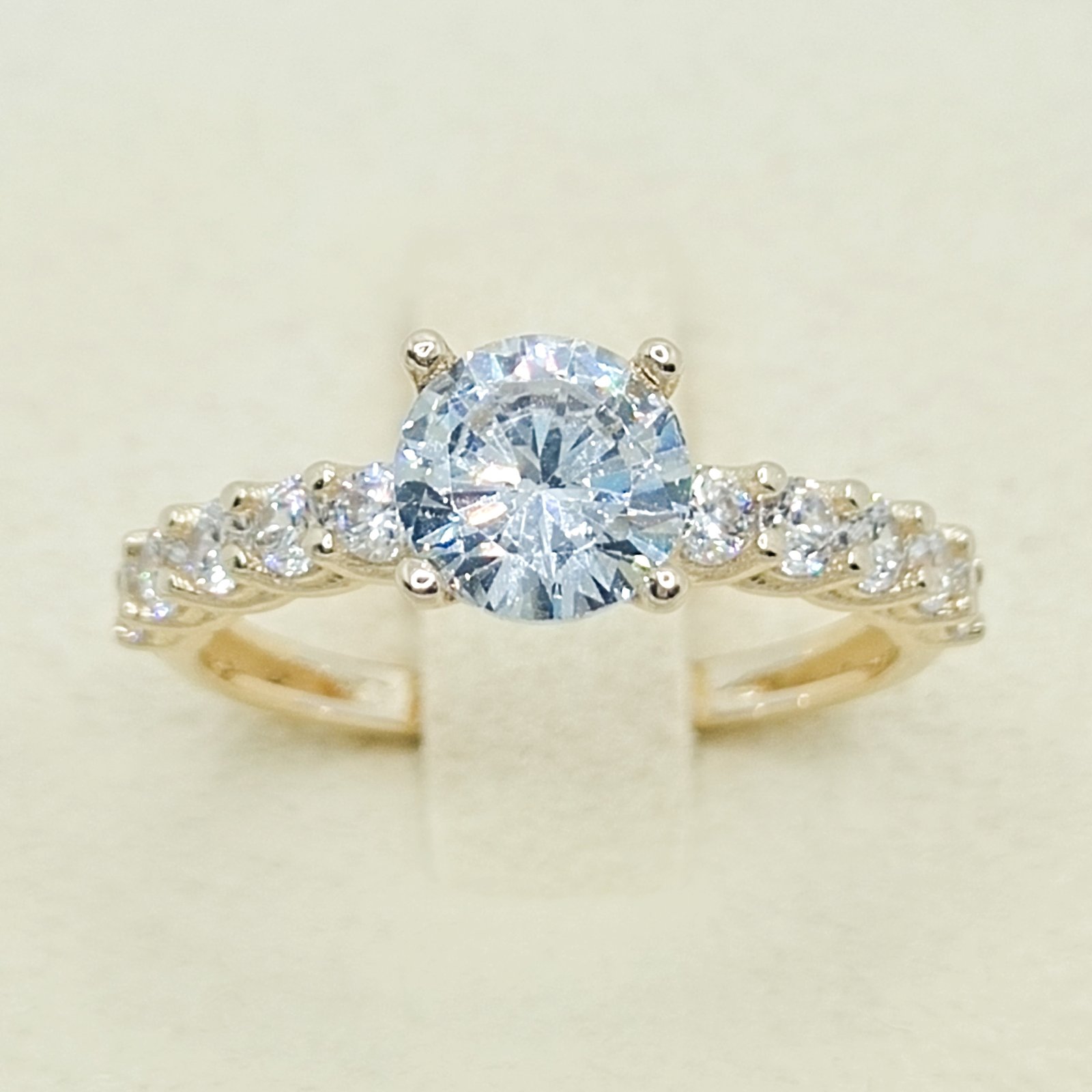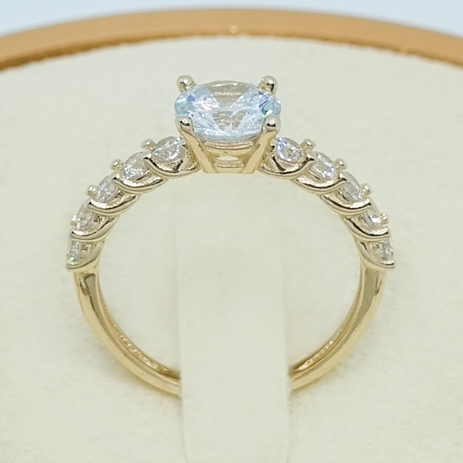 Anillo de oro de 10k con piedra central y pedreria en los hombros.