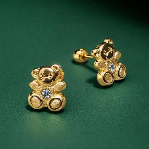 Aretes broqueles de oro de 10k de osito de 7mm de alto con circonia.