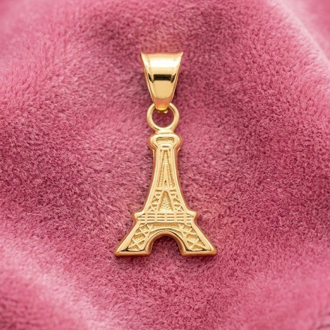 Dije de oro de 10k en forma de torre Eiffel de 9.5mm de ancho por 19mm de alto total.